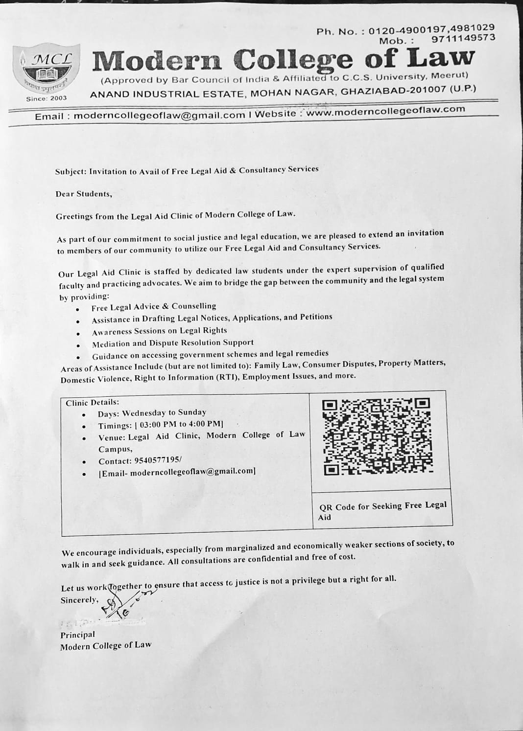 At MCL, we have our very own Free Legal Aid Cell working under the supervision of experienced faculty and students to provide free legal assistance to our students, their relatives, friends, family members and people nearby to college also.